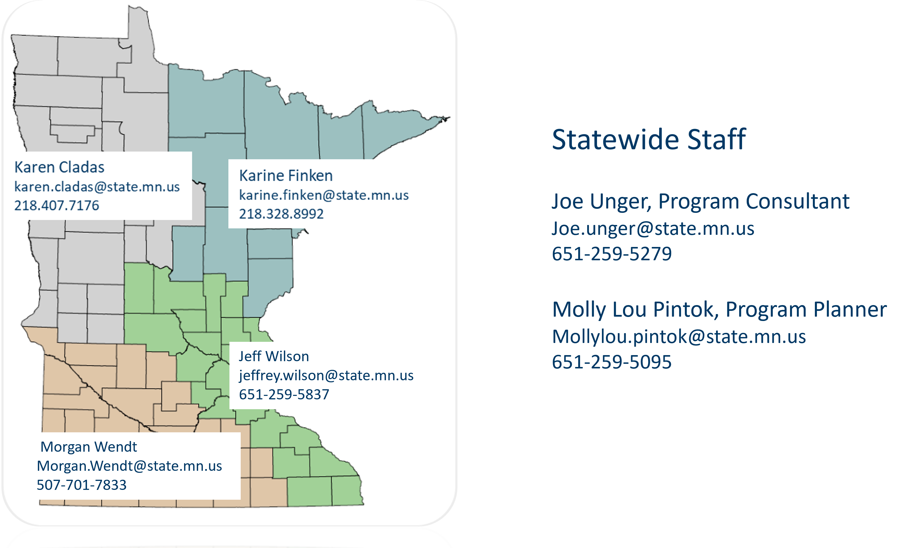 The Minnesota DNR OHV Acquisition and Development (A&D) Specialists are your ATV or ORV club’s “regional voice” and contact to move trail projects forward. They can help you navigate the Grant-in-Aid process, identify local DNR staff and potential local government sponsors, and assist in trail layout and design.